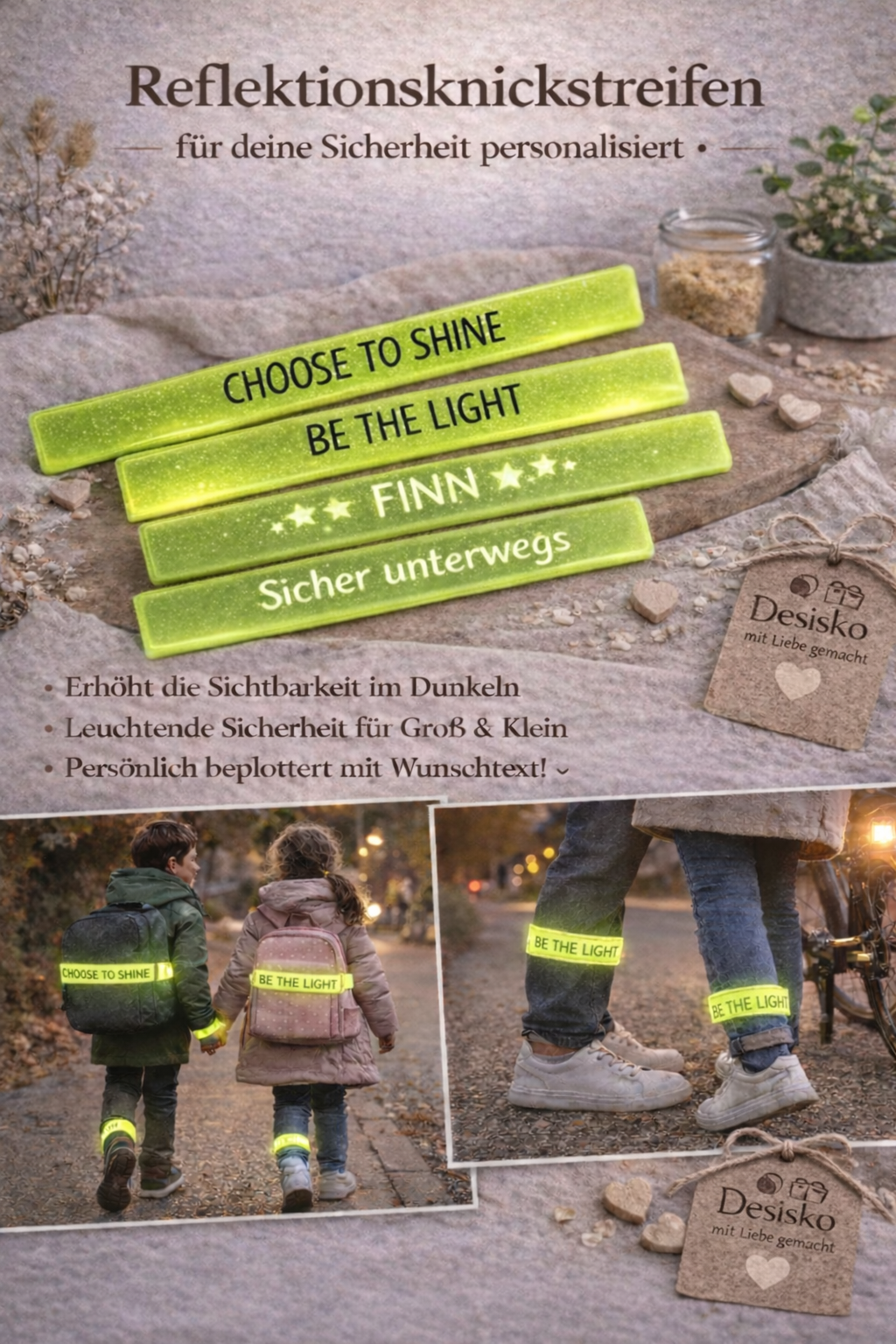 Knick-Reflektionsstreifen personalisiert - Ideal, damit der Nachwuchs sicher in den Kindergarten oder in die Schule kommt.